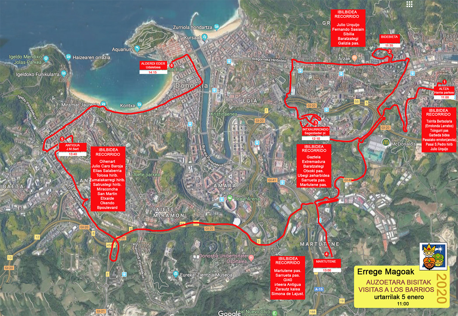 Erregeek geldialdiak egingo dituzte aurrez adierazitako tokietan, Errege Postariek, haiekin batera, hirugarren urtez jarraian, hurbiltzen diren haur guztien gutunak jaso ahal izan ditzaten beren zorro handietan. Ibilbidean zehar, Ekialdeko Magoek beren ibilgailutik agurtuko dituzte Donostiako auzoetan barrena topatzen dituzten guztiak.